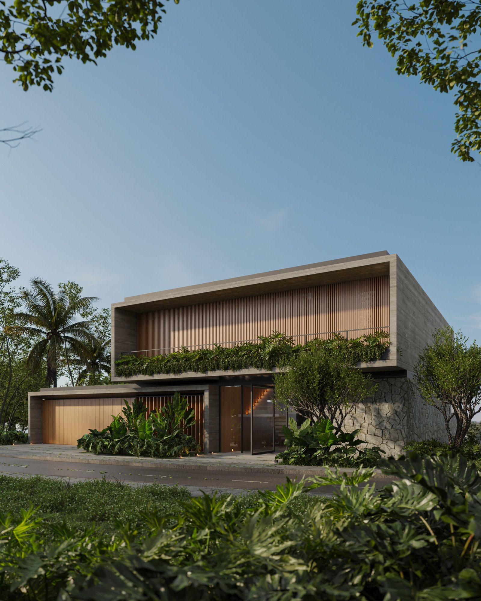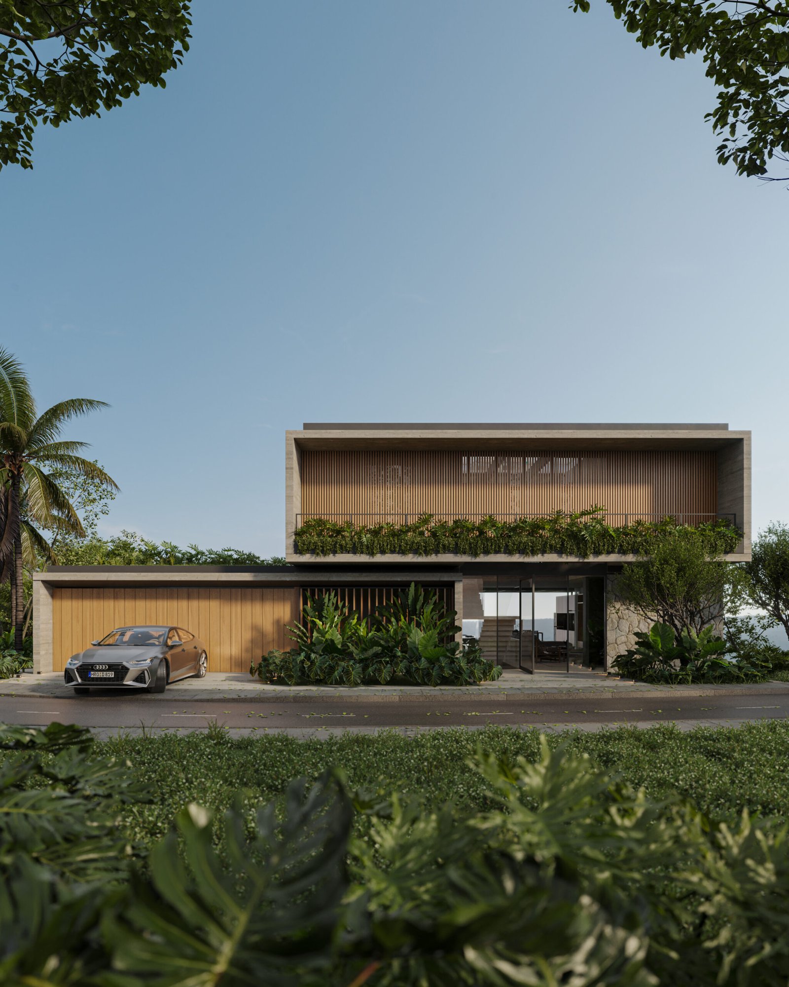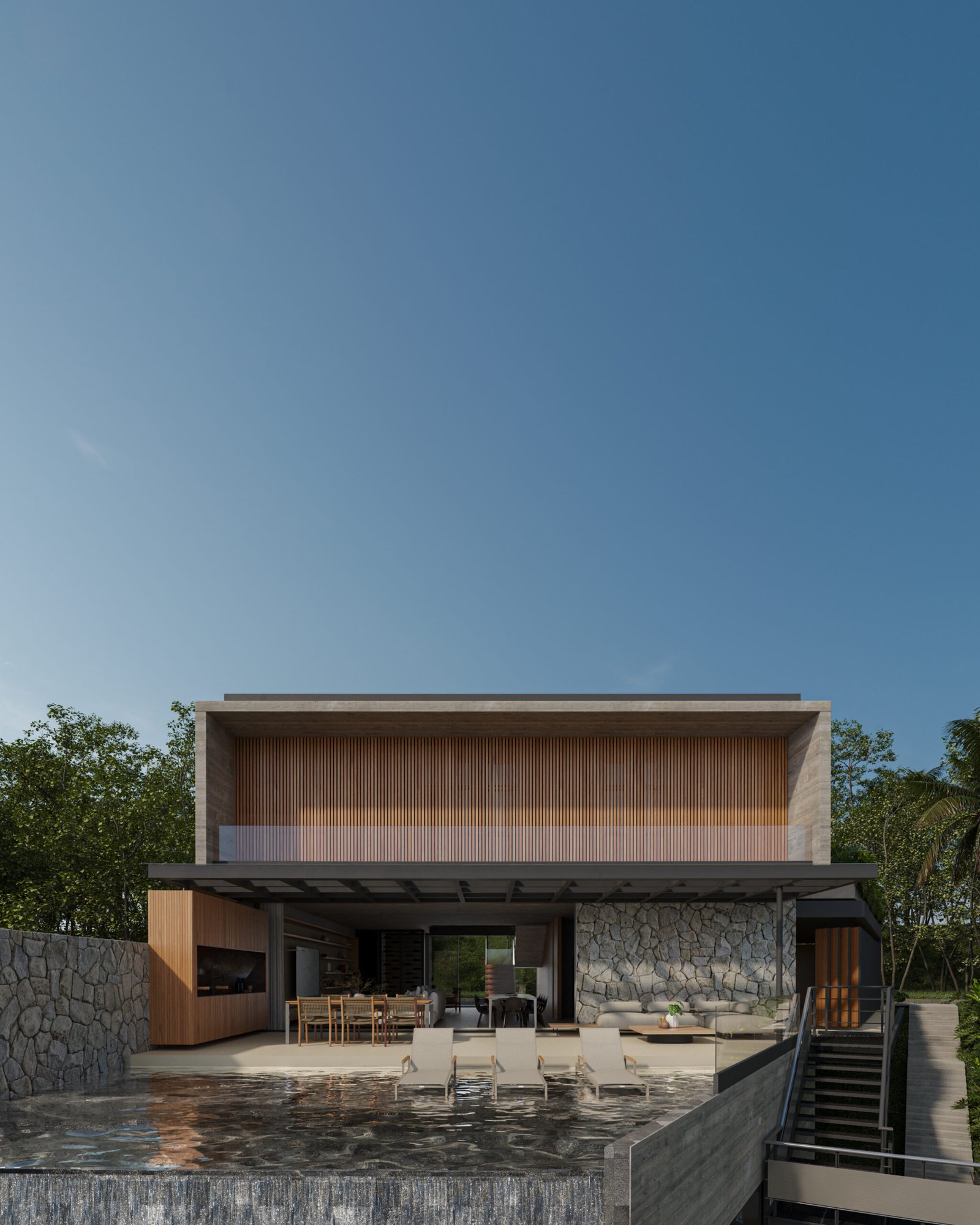 Casa VC – Arquitetura brutalista e tropical em harmoniaA Casa VC é um projeto de residência unifamiliar que une a força do concreto aparente com a leveza da madeira e da vegetação tropical. Assinada pela VK Arquitetos, a casa foi implantada em um terreno com vista privilegiada e desenvolvida a partir de uma volumetria pura e imponente, marcada por grandes planos horizontais. O pavimento superior, envolto por brises de madeira, garante privacidade e controle solar para os dormitórios, enquanto o térreo se abre totalmente para a área de lazer com piscina de borda infinita e integração total com a natureza ao redor. |